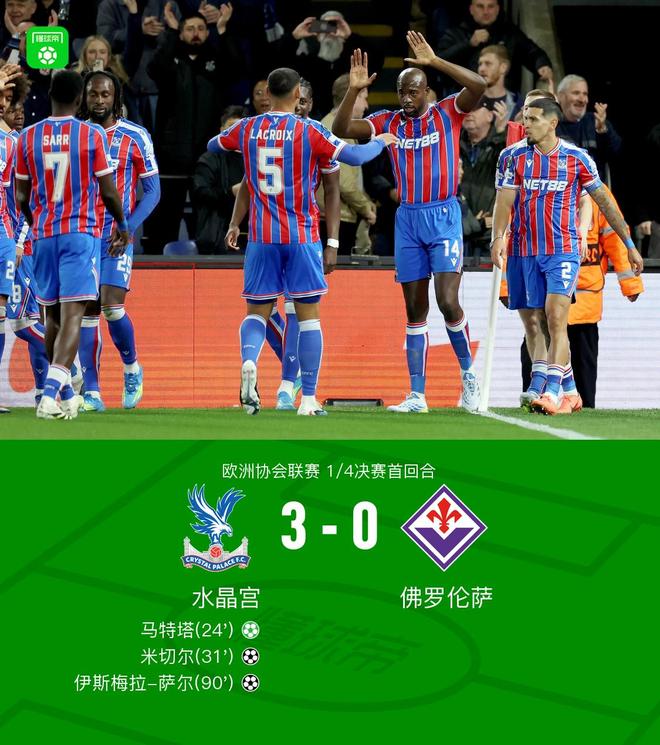 北京时间4月10日欧洲协会联赛 1/4决赛首回合,水晶宫对阵佛罗伦萨。水晶宫马特塔破门,米切尔破门,伊斯梅拉-萨尔破门。最终比分水晶宫 3-0 佛罗伦萨。